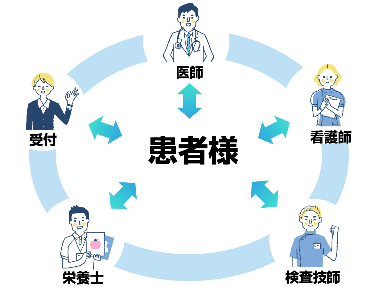当院では3名の医師と看護師のみならず、受付、栄養士、臨床検査技師全員のチーム医療で患者さんの病態改善に取り組んでいます。