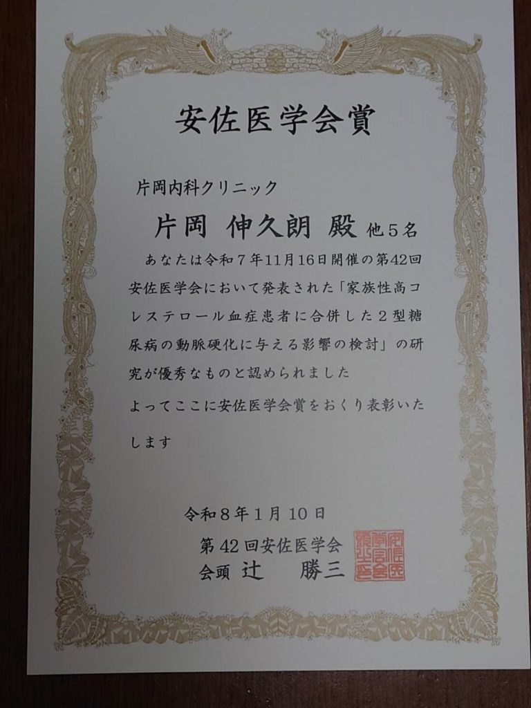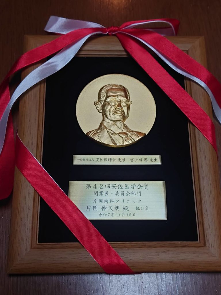 賞状・盾には「片岡伸久朗殿 他5名」となっていますが、クリニックのスタッフみんなで頂いたものと思っています。検査部門のスタッフのみならず、片岡内科クリニックスタッフ全員で行ってきたチーム医療の賜物といえるでしょう。