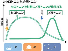 日中にセロトニンがしっかり分泌されると、これが材料となって夜には「睡眠ホルモン」であるメラトニンに変わり、眠りをサポートしてくれます。セロトニンとメラトニンは図(8月23日付け読売新聞より許可なく転載)のような関係にあり、朝日を浴びて規則正しく生活することで、夜間のメラトニンがしっかり分泌され、体内時計が調節されます。逆に不規則な生活や太陽光を浴びないような生活はメラトニンが不足し、不眠症の原因になりかねません。
